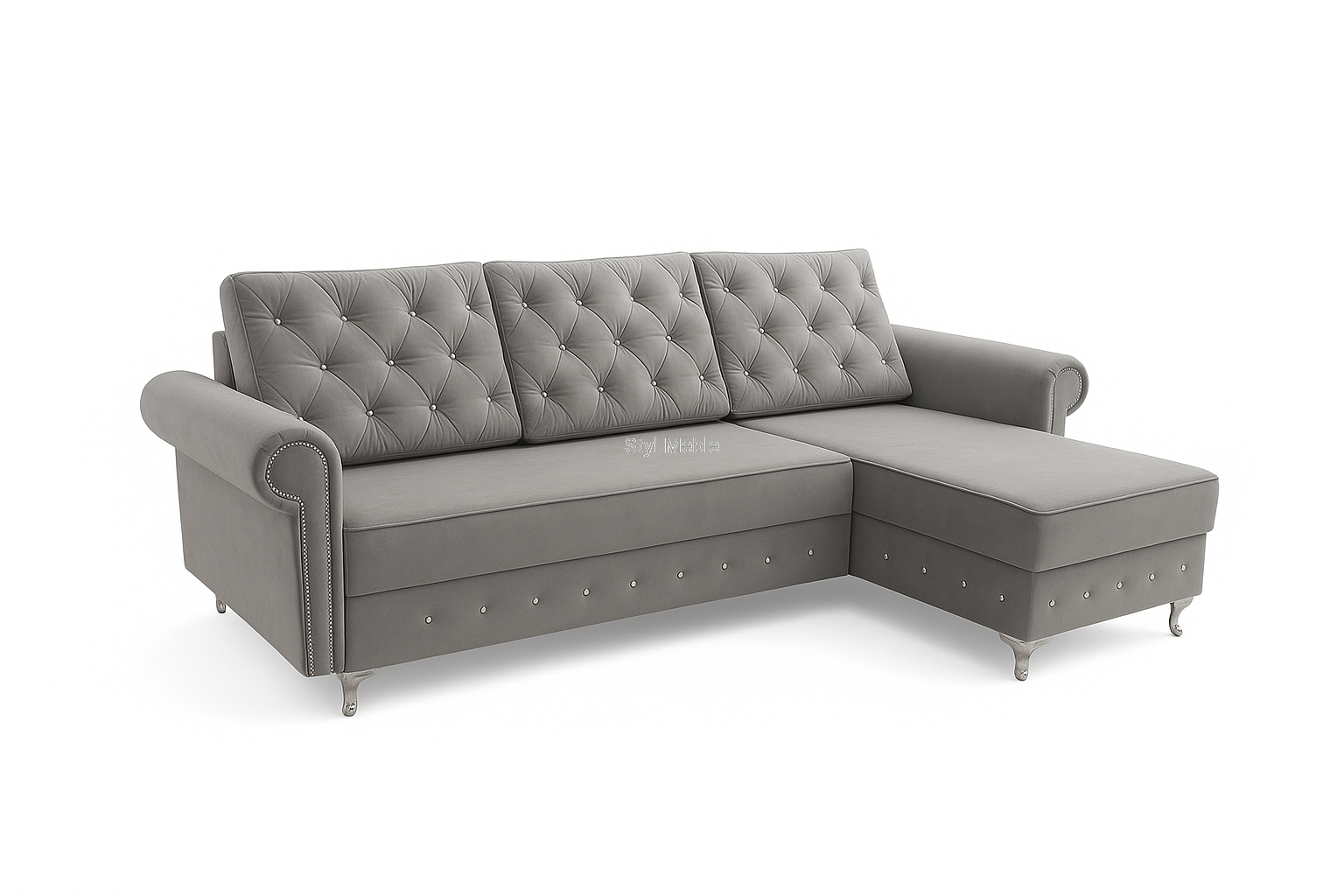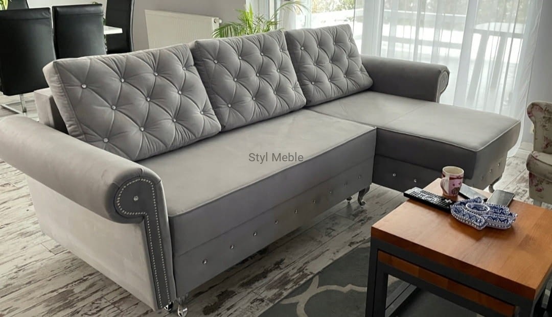 Poduszki oparciowe pikowane są kryształkami, kryształki są bardzo trwałe i mocno przyszyte. Pikowana jest również dolna skrzynia przy siedzisku. Narożnik można również ozdobić listwą pinezkową na bokach. Prosimy o informacje podczas składania zamówienia, odnośnie wyboru zdobień.